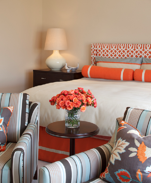 I especially liked the pillows in the House Beautiful Room that have orange & blue on a gray background. They are on the pic with the orange/white geometric headboard. These would work perfectly in the room I am currently working on. Any ideas where this fabric is from?